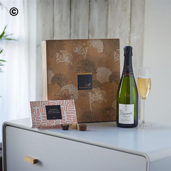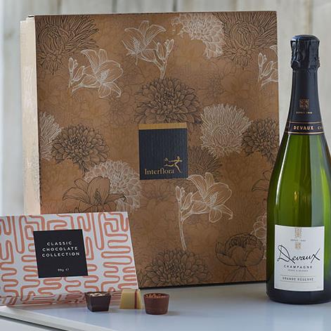 The perfect gift for that friend who enjoys the finer things in life! This gift set includes a 75cl bottle of Devaux Grande Reserve champagne and a box of delicious chocolates in a presentation box.