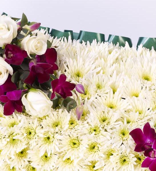 A classic pillow-shaped design created using a mass of white double spray chrysanthemums and finished with a spray of white large-headed roses and purple dendrobium orchids.