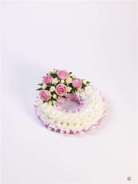 A classic circular wreath covered with a mass of white double spray chrysanthemums and finished with a pink and white spray of roses and spray roses and finished with a pink ribbon trim. Approximate diameter 50cm (19 inches).