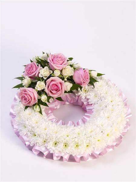 A classic circular wreath covered with a mass of white double spray chrysanthemums and finished with a pink and white spray of roses and spray roses and finished with a pink ribbon trim. Approximate diameter 44cm (17 inches).