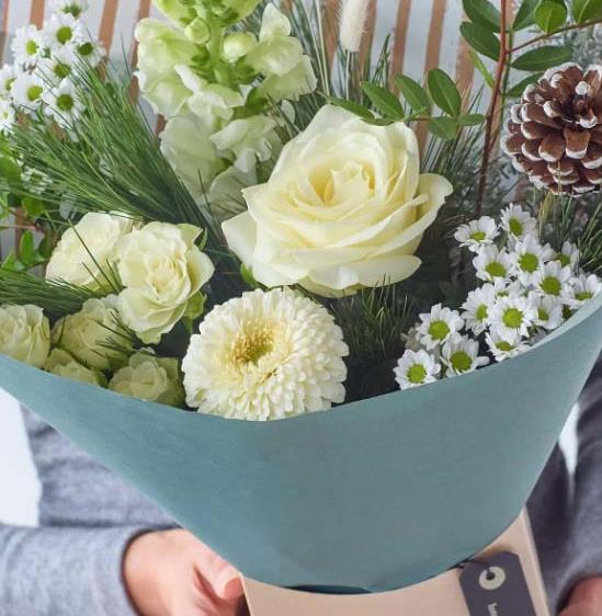 A beautiful little gift box of fresh flowers in soft muted shades, chosen and arranged by hand by a local florist.