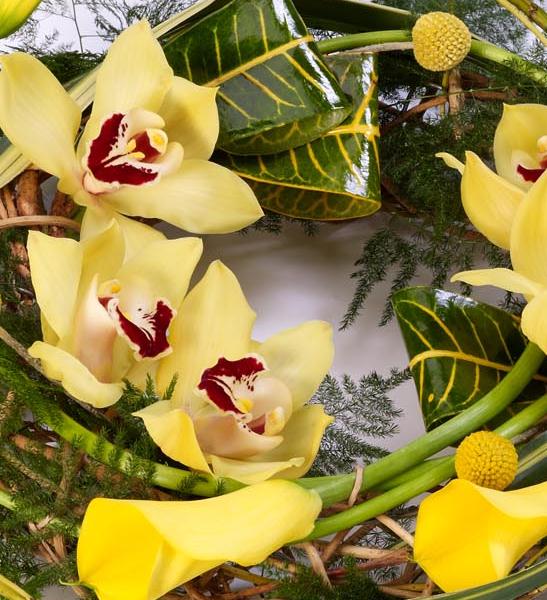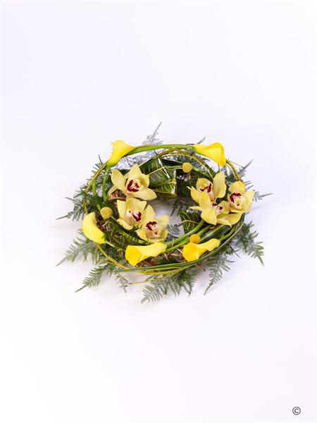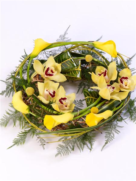 Yellow calla Lily and cymbidium orchids are entwined with cornus Stems, craspedia and asparagus fern around a circular willow frame to create this woodland wreath. Approximate diameter 50cm (19 inches).