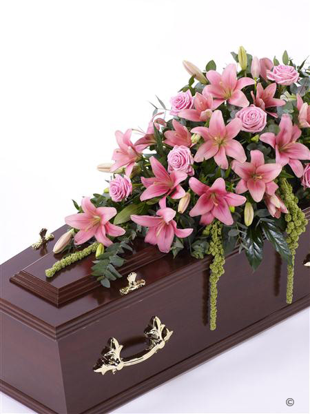Beautiful Asiatic Lily and large-headed Rose in pretty pink are used to create this elegant casket spray. The fresh flowers are enhanced with trails of green amaranthus as well as ruscus, aralia leaves and eucalyptus. Approximate height 122cm (4ft).