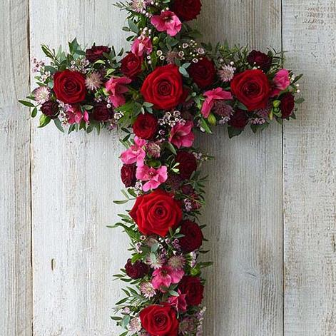 A cross featuring rich red and pink blooms including roses, alstroemeria and astrantia.