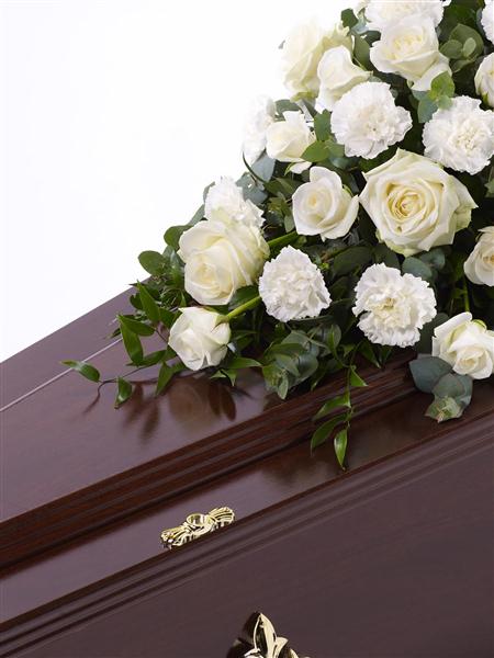 Large-headed white Rose combine with white carnations and luxurious foliages to create this traditional casket spray. Approximate height 92cm (3ft).