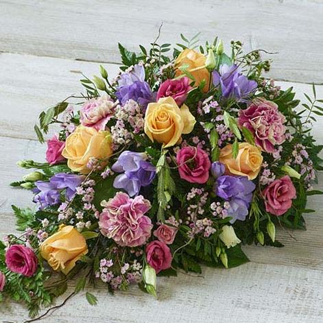 A profusion of fragrant pastel blooms arranged in a teardrop shape. Features scented freesia, peach roses, and natural willow and grass.
