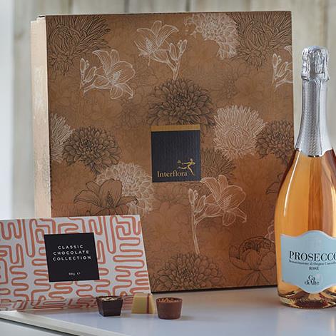 Featuring a 75cl bottle of sparkling Rosé Prosecco and a box of delicious chocolates in a presentation box.