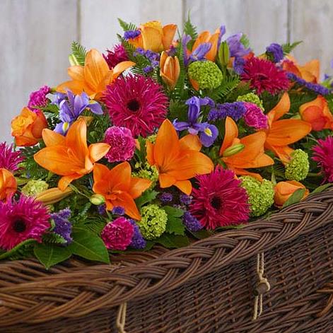 A casket spray of beautifully bright blooms including cerise carnations, orange roses and striking orange lilies.