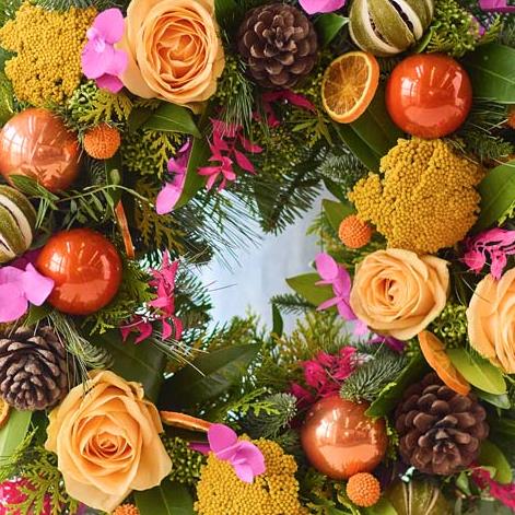A vivid, colourful wreath made using vibrant fresh flowers and foliage expertly chosen and arranged by a local florist.